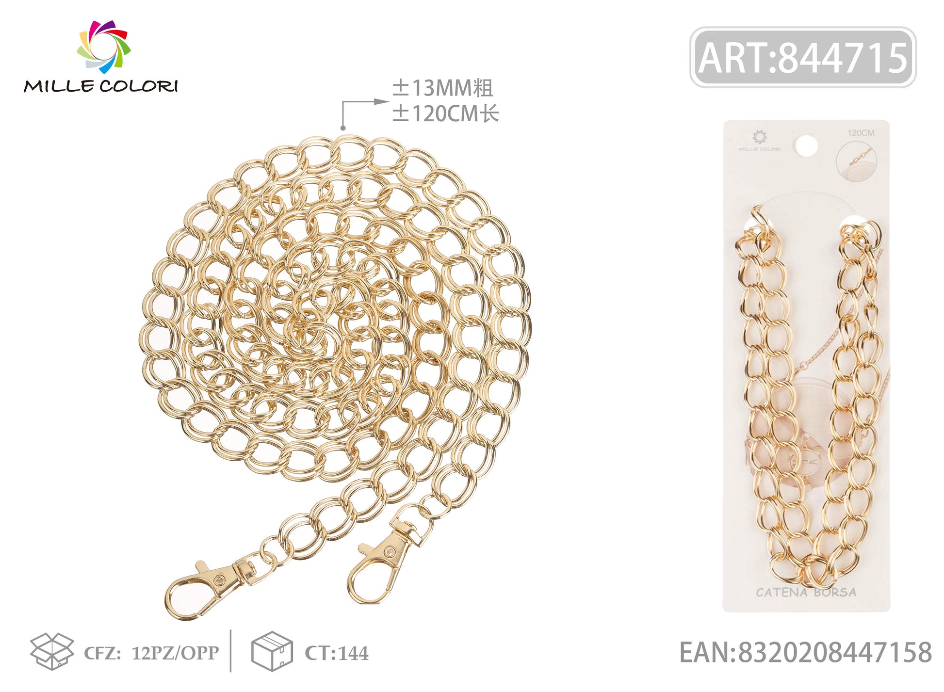 Catena per Borsa Tracolla in Metallo Dorato con Maglia XXL e Moschettoni - 120 cm/13mm