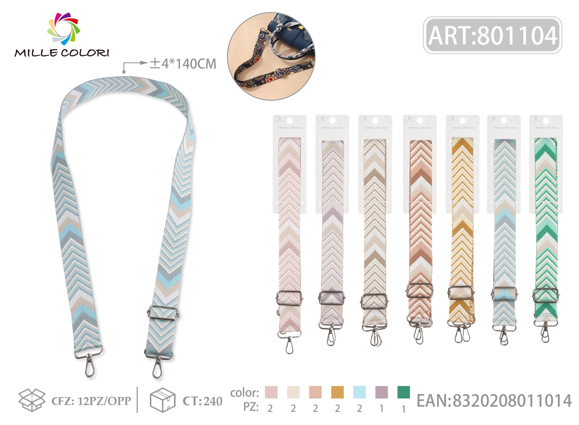 Tracolla Regolabile per Borsa Cinturino con Motivo Chevron Pastello,Ganci in Metall -140cm/4cm