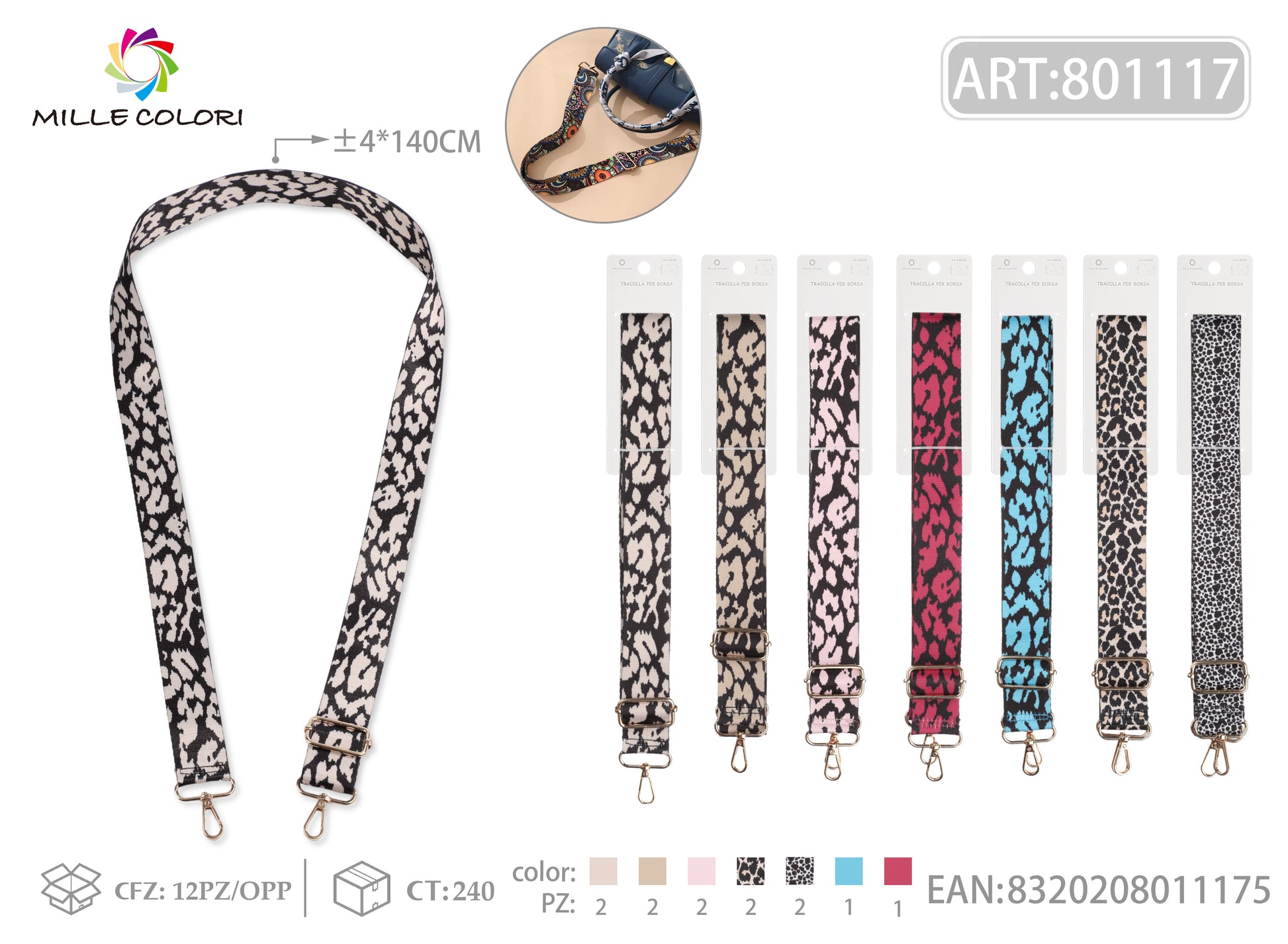 Tracolla Regolabile per Borsa – Fantasia Animalier Leopardata, Ganci in Metallo -140cm/4cm