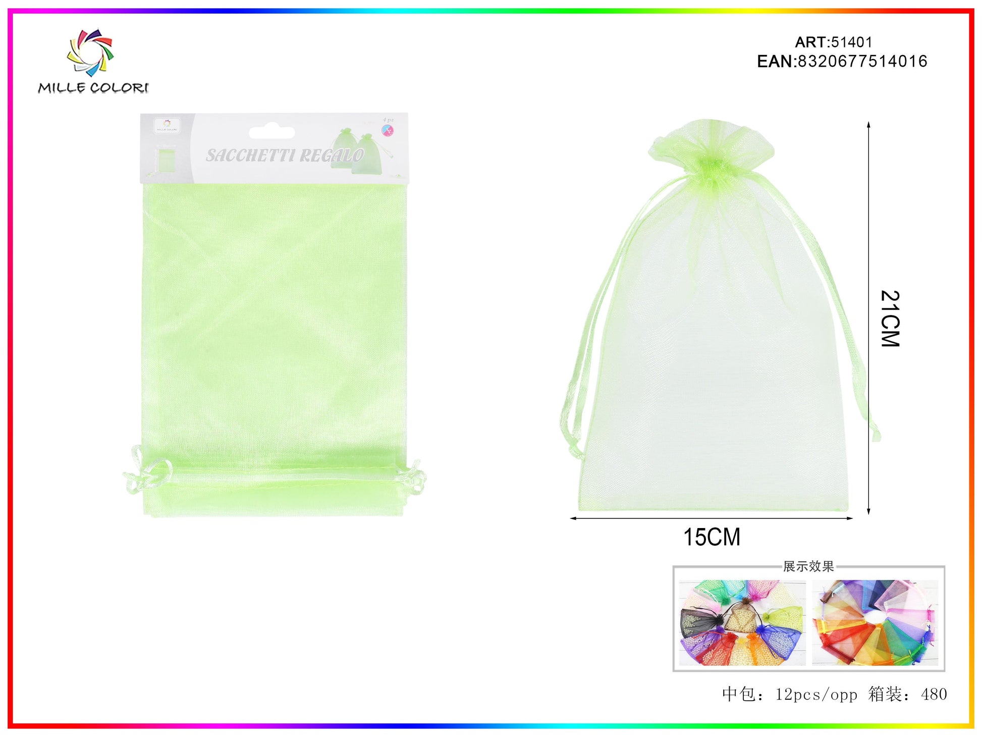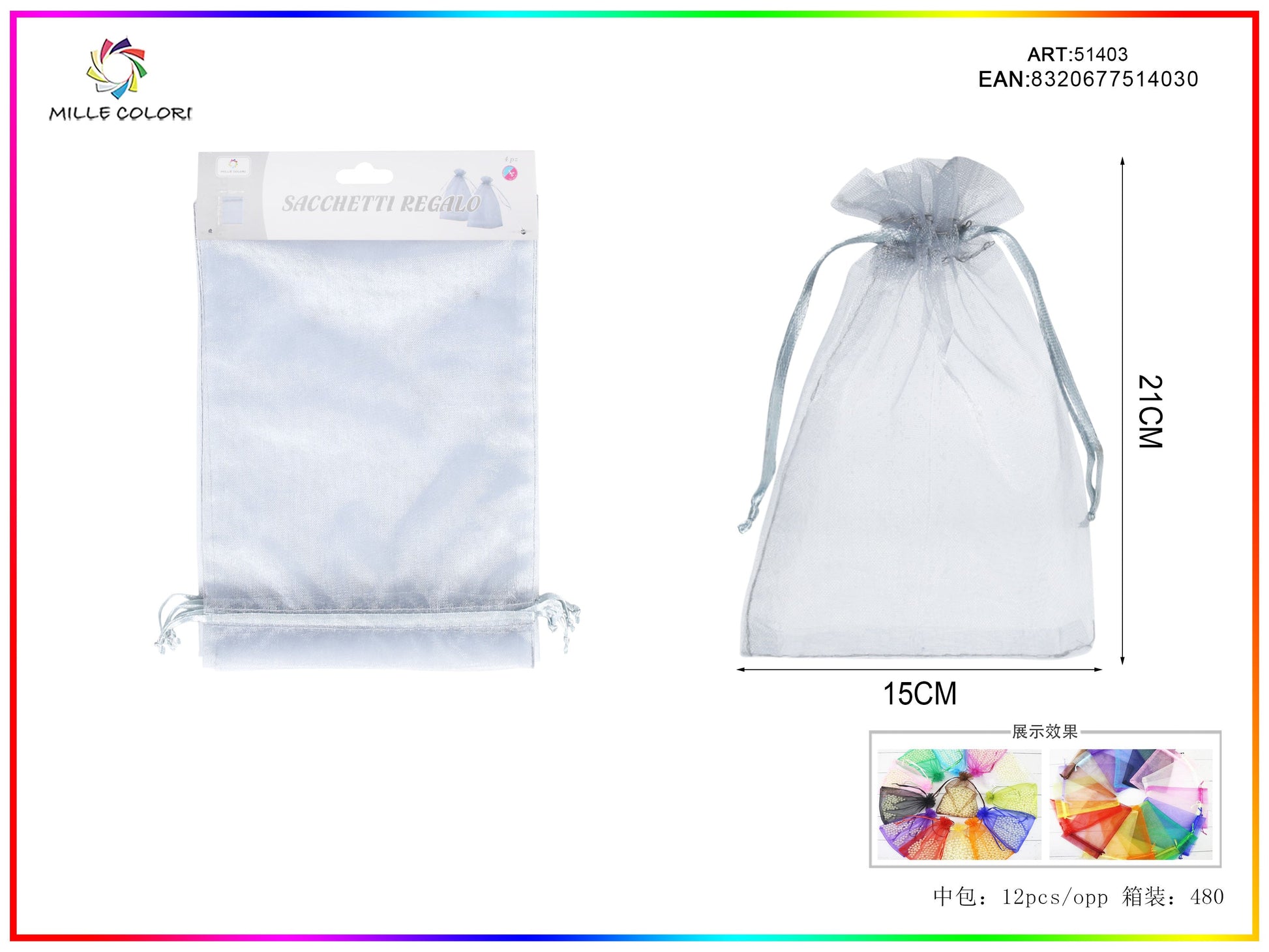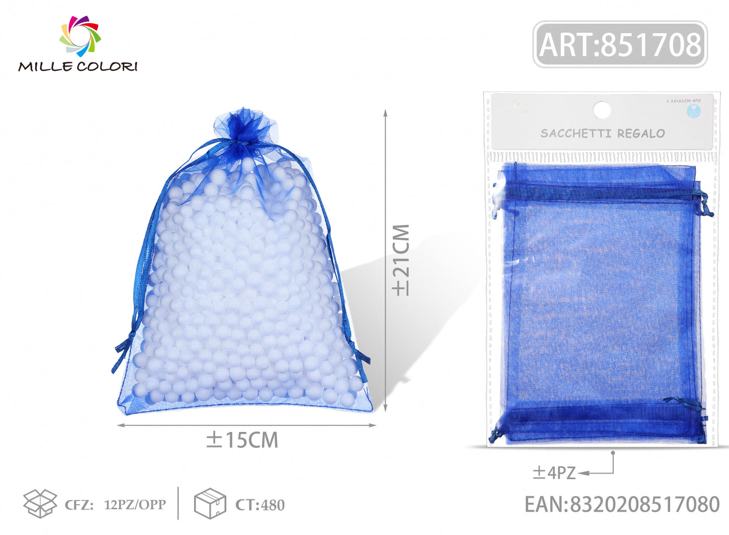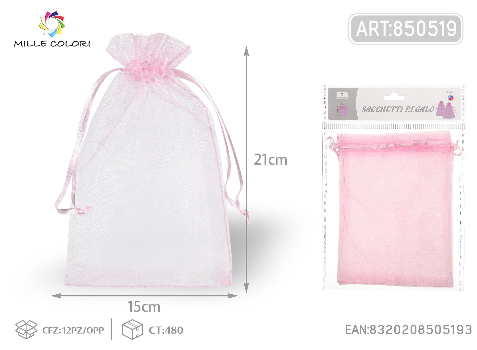 Sacchetti in organza di alta qualita, eleganti e versatili, perfetti per regali, bijoux e piccoli oggetti. Disponibili in diverse misure e colori, con chiusura a laccio pratica e raffinata.
