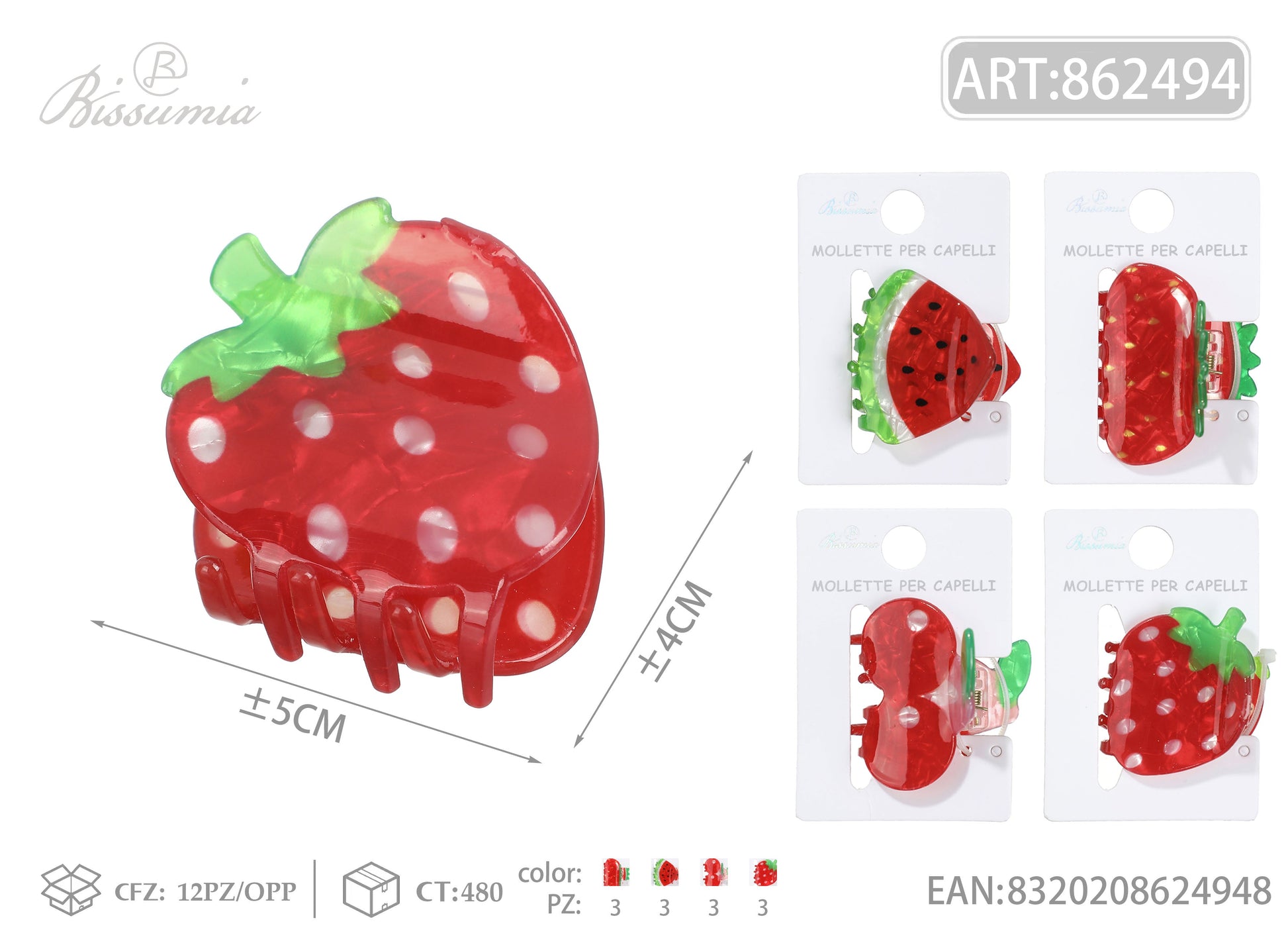Set 4pz Mollette per Capelli Frutta Double Face 5cm rosso